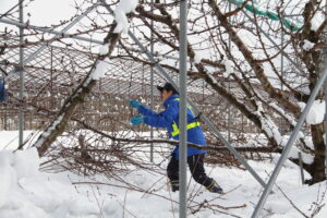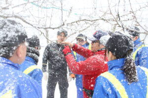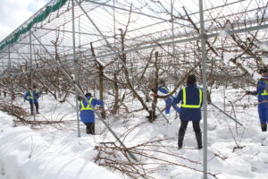 今年は、天童の王将果樹園さんの剪定枝を回収させて頂きました。王将果樹園さんからは、剪定の必要性やなどのレクチャーを受け作業を行いました。